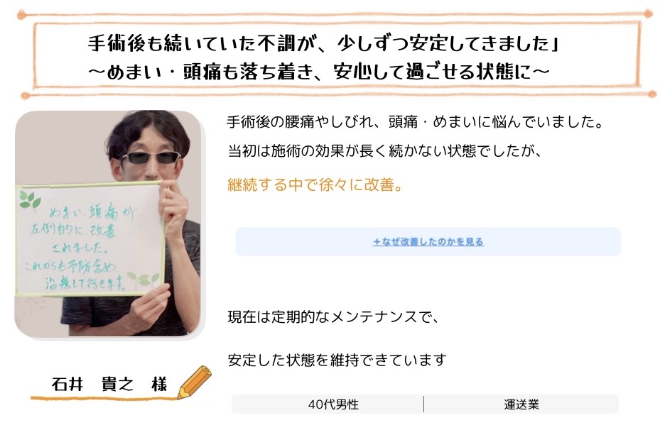 最初は耳鳴りや目眩で通い始めて、以前のお店で担当いただいてた時から