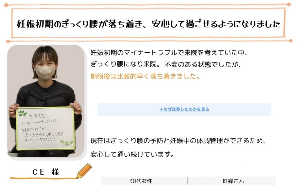 寝違えの悩みは全くなくなりましたが、現在も良い状態をキープするためにお世話になっています。また,妊娠中の体のサポートもしてもらっています。