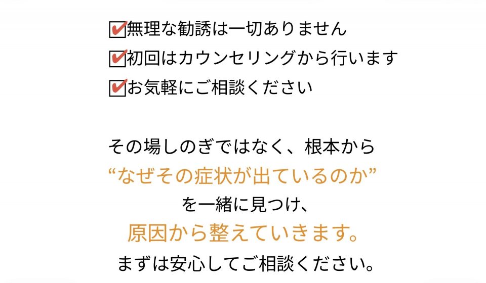 もし今まで、いろいろ試しても改善しなかったのであれば “原因に合った施術”を一度受けてみてください。