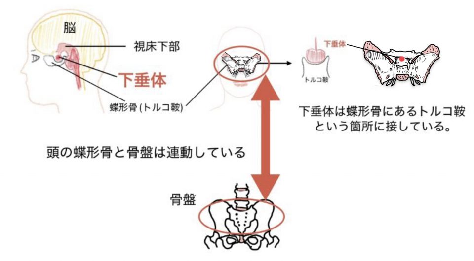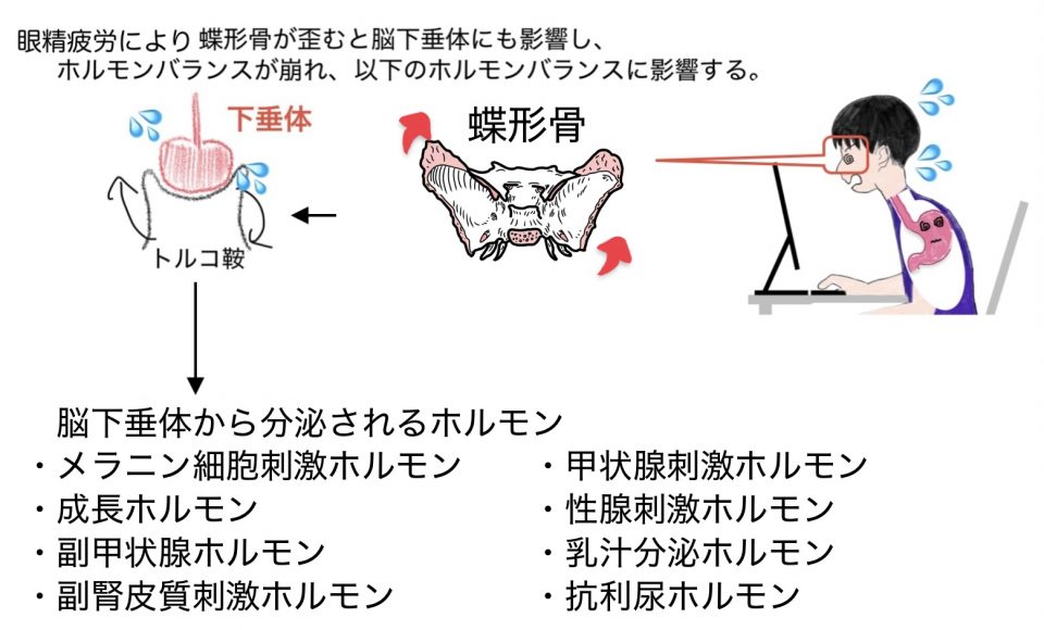 また、蝶形骨が歪むと、蝶形骨に接している脳下垂体のはたらきも悪くなります。