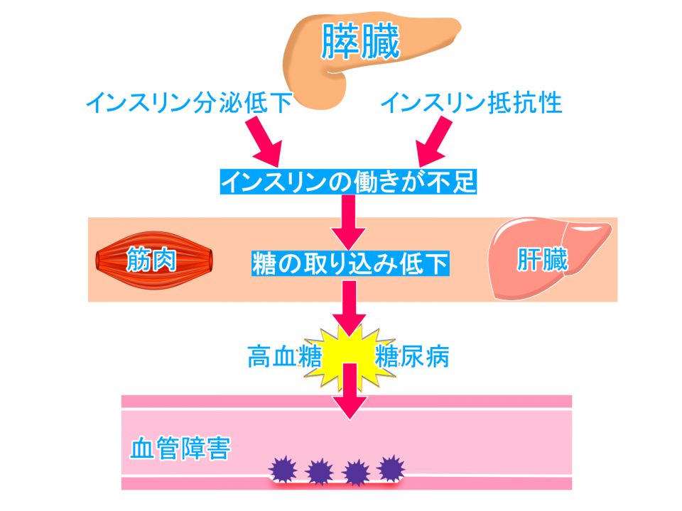 血管内に糖がたくさんある状態が長く、何回もあると、膵臓が疲弊してインスリンの分泌が乏しくなり、血管内の糖を吸収できずに、血管内に糖があふれていしまいます。