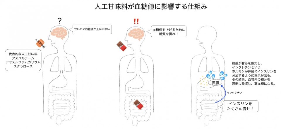 人工甘味料は血糖値を上げないから、影響ないのでは?
