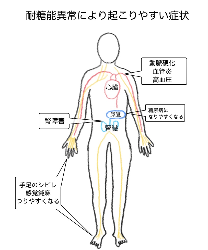 耐糖能異常とはつまり、糖尿病ほどではないが血糖値が正常よりも高い状態を維持する、ということです。
