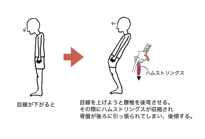 これは首の前側の筋肉が収縮することで目線が下がり,頭が前に出るようになります。目線が下がると前が見えなくなるので、腰椎が後弯(後ろにしなる)することで目線を上げます。この際に裏ももの筋肉(ハムストリングス)が収縮するので、結果として骨盤が後傾します。