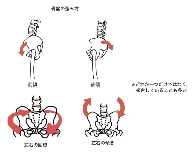 それにより骨盤は前・後傾と左右の傾き、左右の回旋が強制され,いわゆる骨盤の歪みとなってしまいます。
