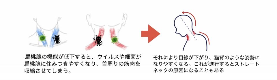 そして,首の前側の筋肉を収縮させる原因は姿勢によるものや、先ほどの内臓下垂なども考えられますが、扁桃腺の機能低下によっても起こり、意外とそれが原因となっていることが多くみられます。