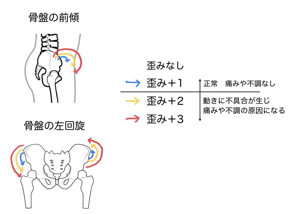 骨盤が+1前傾し、+1左回旋している方が動かしやすく、また痛みや不調もないという方もよくみられます。