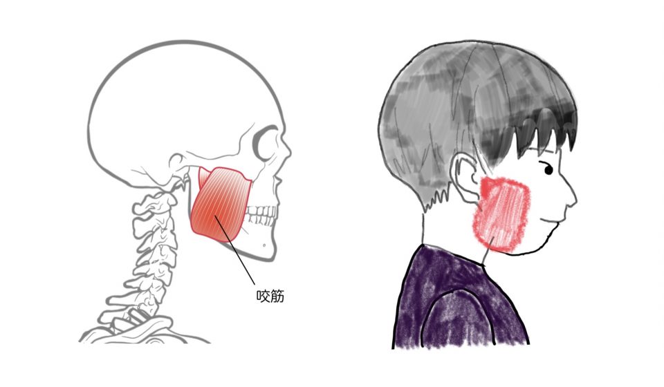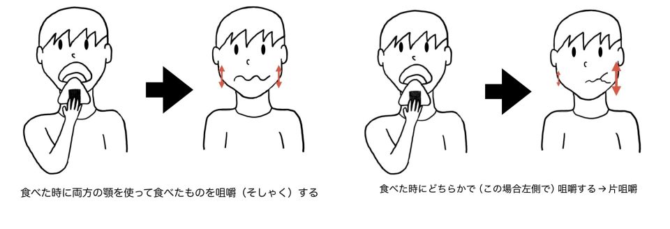 噛む時に使う「咬筋(こうきん)」という顎を動かす筋肉に、よく使う側とあまり使わない側の筋収縮の左右差が生じることで影響を及ぼすようになります。