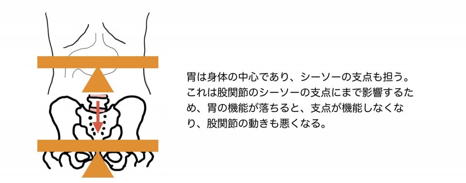 つまり、胃は消化器の機能だけでなく、身体の軸の支点になるという運動器としての機能も担っています。