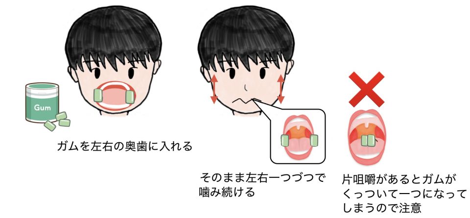 やってみるとなかなか難しく、意識していないと片噛みしている側で左右にあるはずのガムが合わさってしまいます。