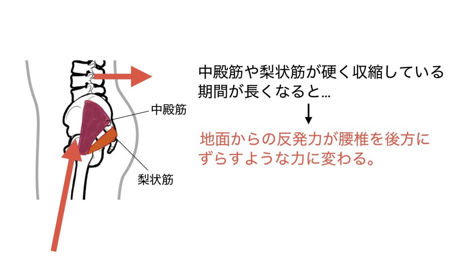 股関節周りの筋肉(中殿筋や梨状筋など)が硬くなると、地面からの衝撃を受け止められず、