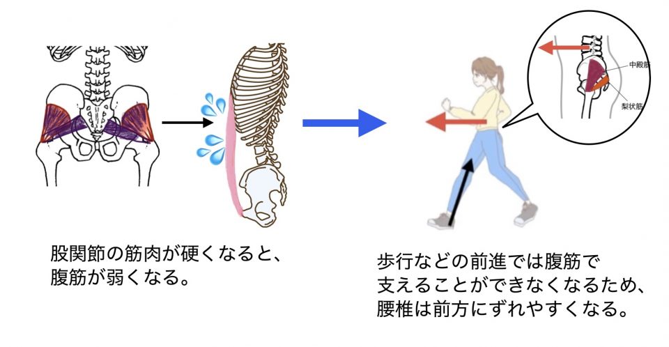 股関節の筋肉が硬いことで腹筋が弱くなり、歩いたりなどの前進の動きになると、今度は腰椎を前方にずらす力がはたらくようになります。