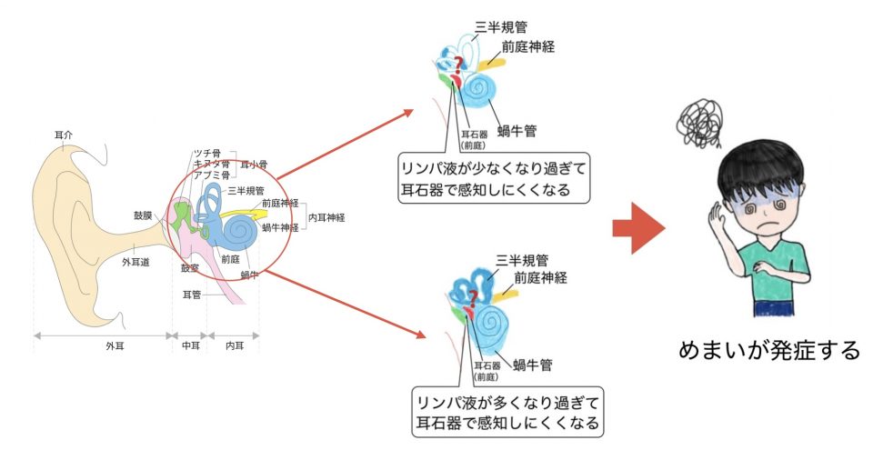 その何らかの異常のほとんどが三半規管に流れているリンパ液にあります。平衡感覚は身体の各部分がどこにあるのかをこのリンパ液が流れ、耳石器が感知し、神経を通って脳に伝達して脳で判断しています(これを位置覚といいます) 。ですが、リンパ液が少なかったり、多かったりすることで、耳石器が感知できなくなり、平衡感覚がはたらかなくなった状態をめまいと言います。