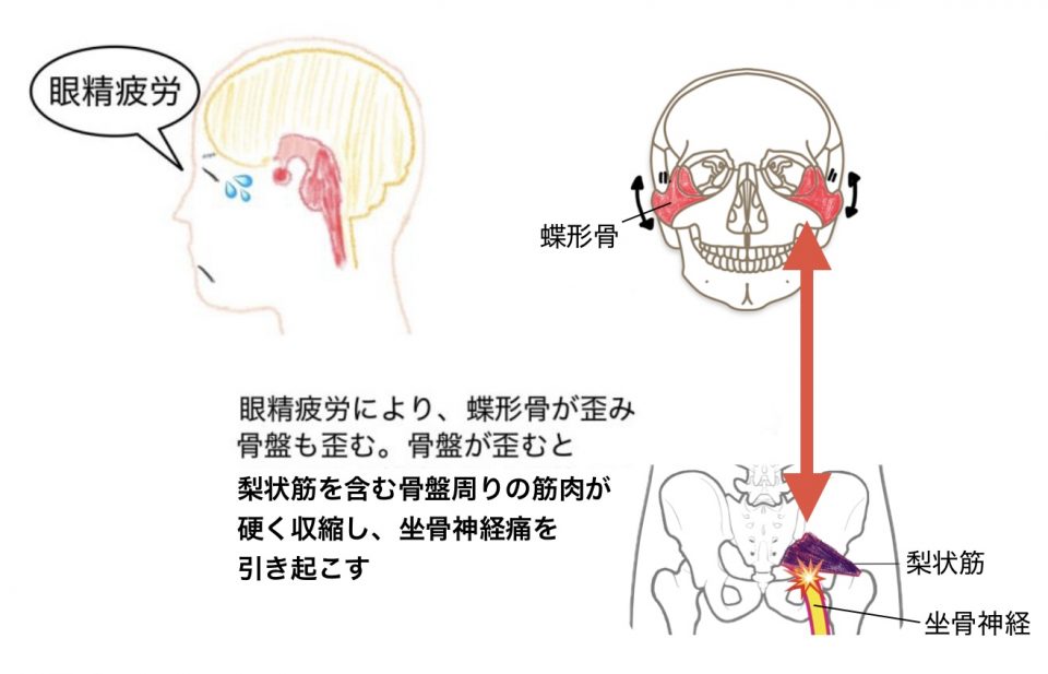 パソコン作業などが多いと画面と目の距離が近くなり、頭の位置が下がることで骨盤が前傾してしまうことも原因ですが、このタイプの一番の原因は、目の疲労により頭の中にある蝶形骨が歪み、それにより骨盤も歪んでしまうことです。