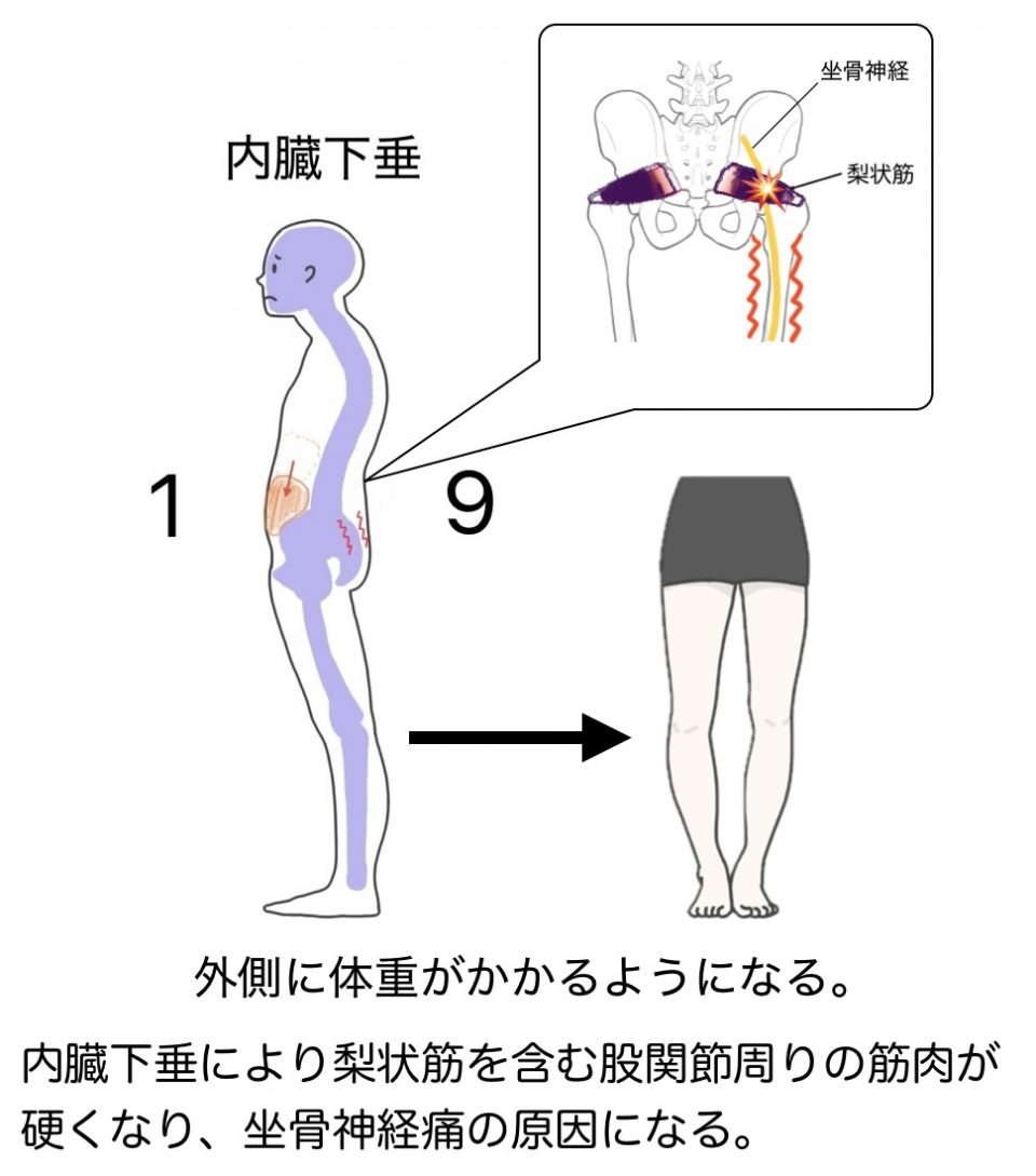 骨盤が歪み、股関節周りの筋肉に負担がかかり、坐骨神経痛を引き起こしやすくなります。