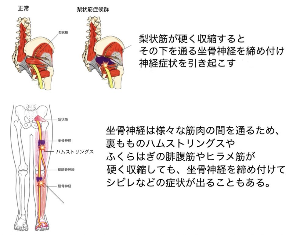 それにより梨状筋が神経や血管を締め付けてしまい、坐骨神経痛が起きてしまいます。